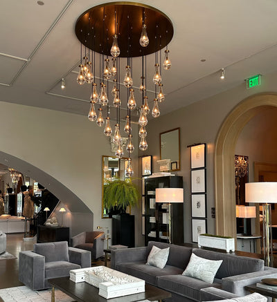 Hand-blown glass droplets and a circular frame create a soft, rain-inspired glow that brings elegance and warmth to any room.