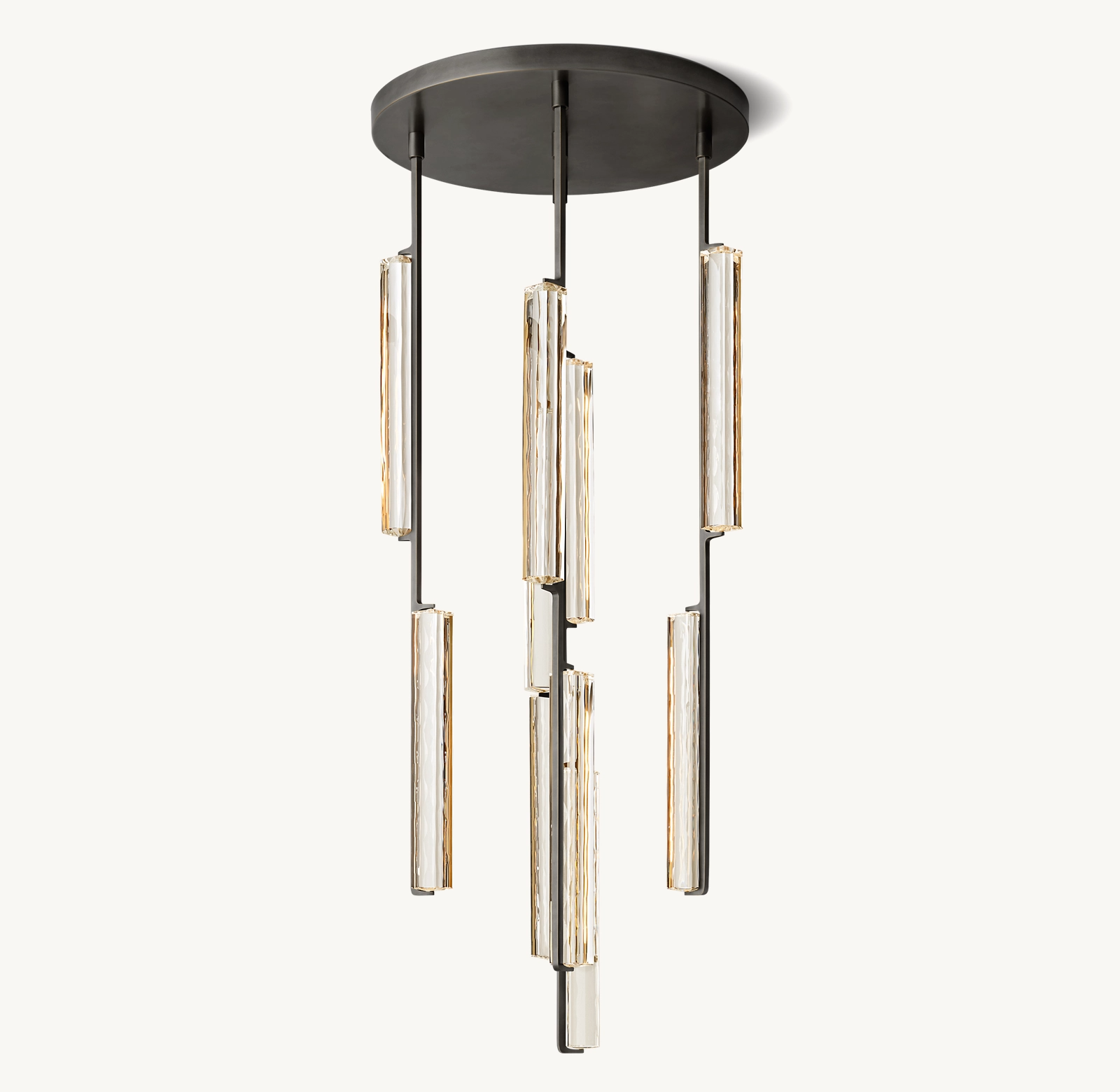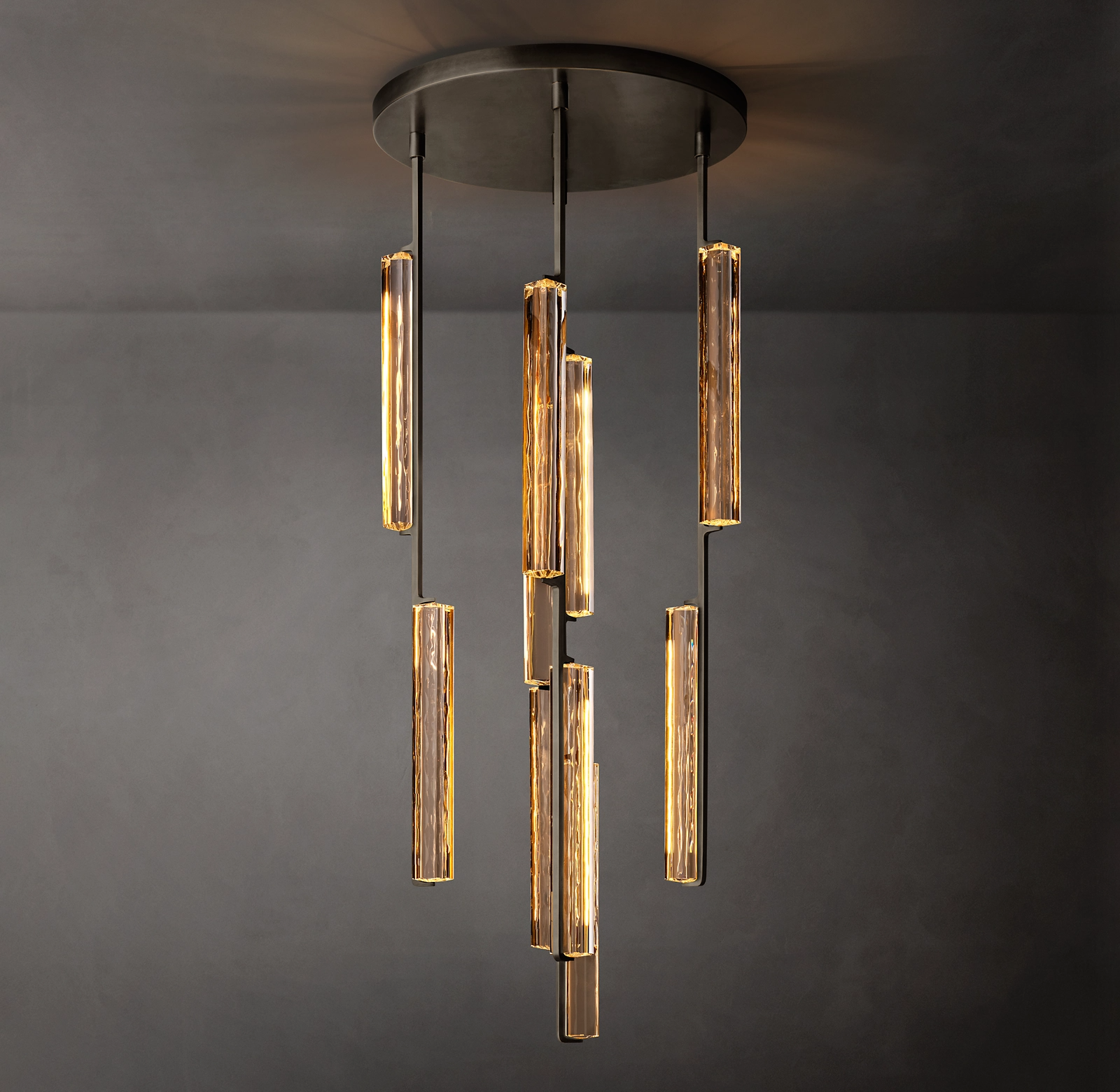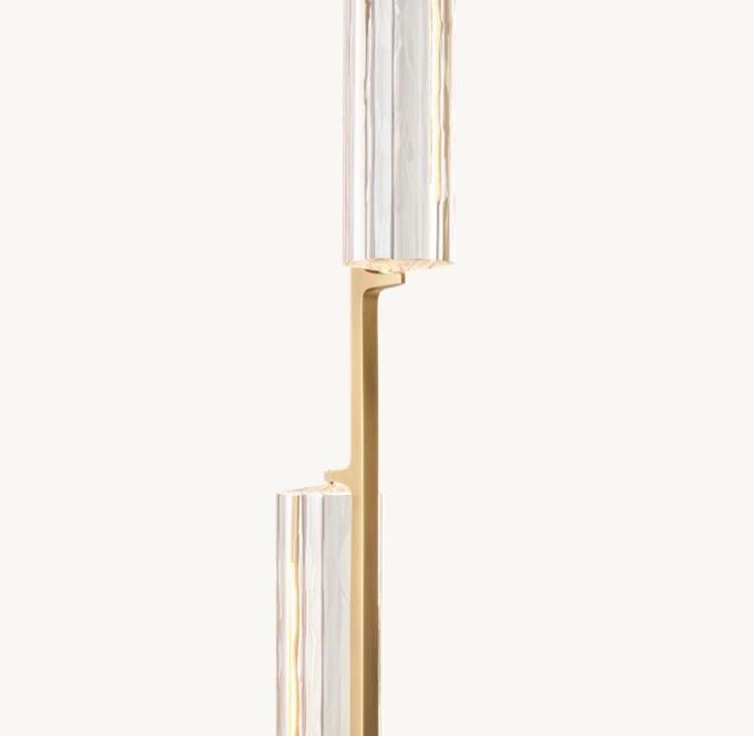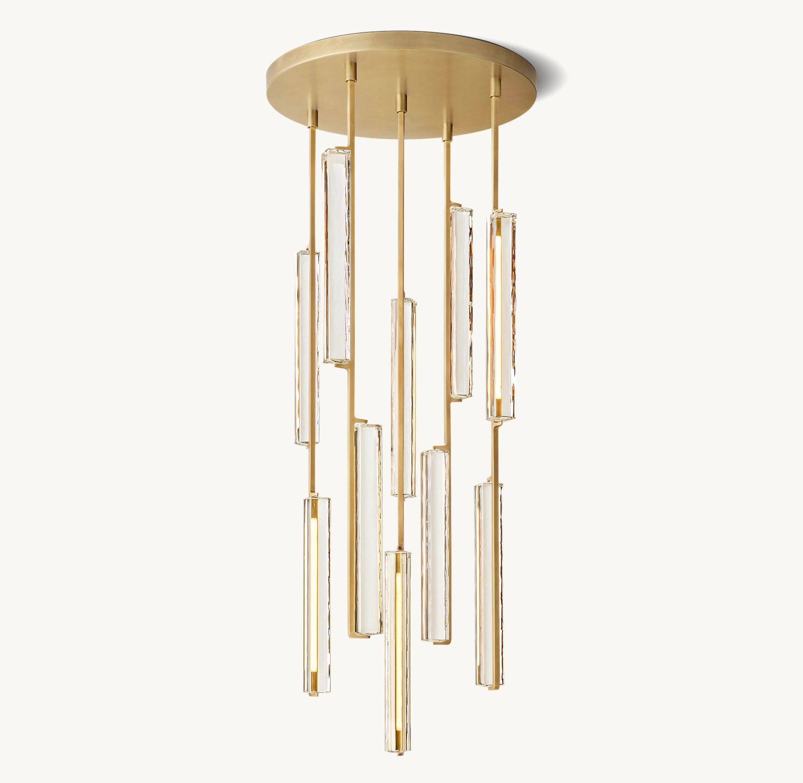 Audubon Crystal Round Chandelier 24" captures the spirit of 1960s Italian minimalism, cascading from above with 10 prisms of hand-polished K9 crystal suspended on vertical brass drops. Striking yet restrained, it evokes the warmth of candlelight with elongated LEDs that cast a beautiful glow through the undulating texture of the glass.