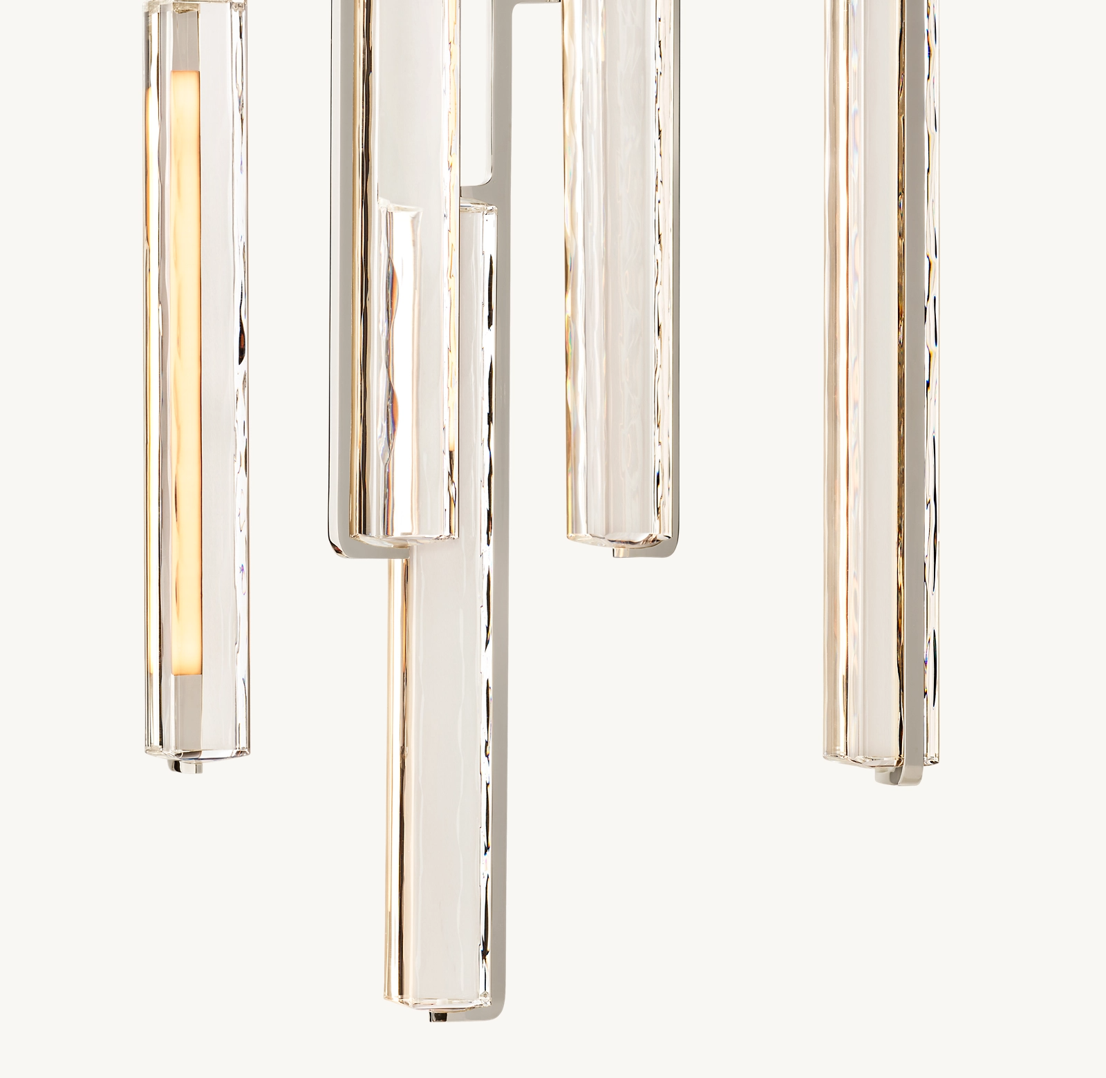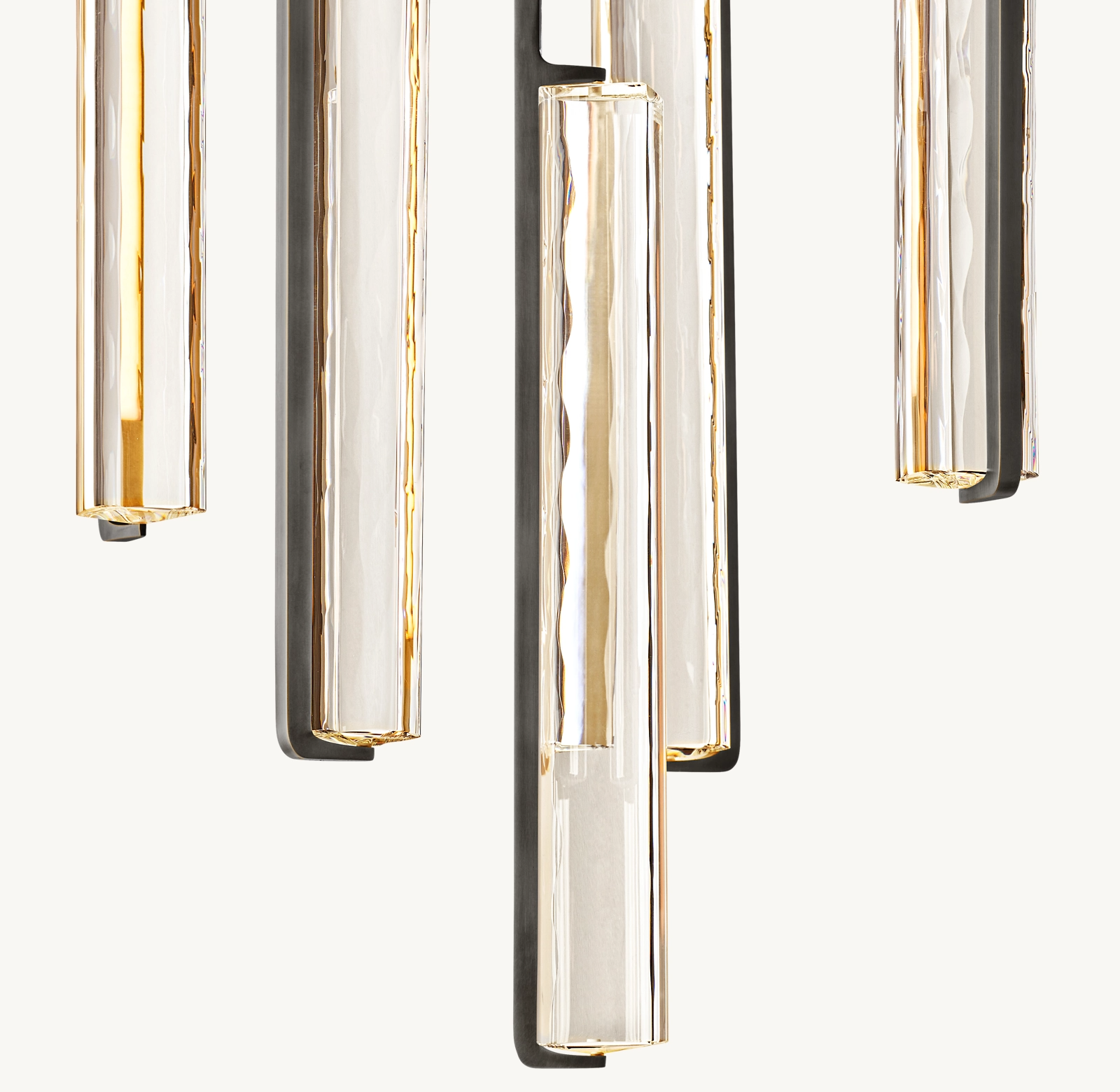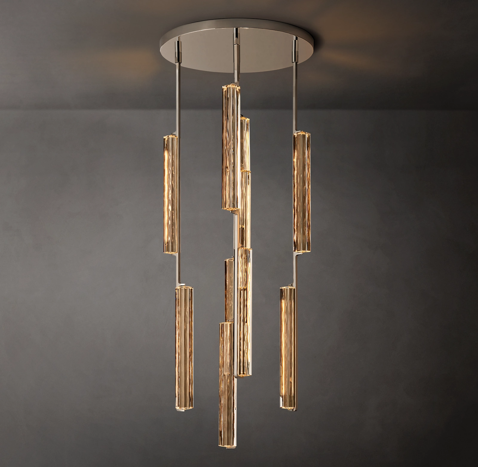 Audubon Crystal Round Chandelier 24" captures the spirit of 1960s Italian minimalism, cascading from above with 10 prisms of hand-polished K9 crystal suspended on vertical brass drops. Striking yet restrained, it evokes the warmth of candlelight with elongated LEDs that cast a beautiful glow through the undulating texture of the glass.