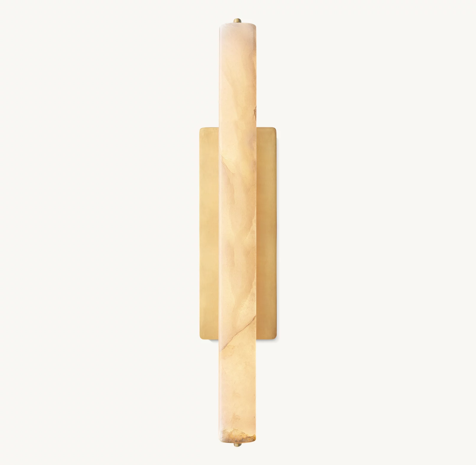 Inspired by 1960s Italian minimalism, the Audubon Alabaster Single Sconce  appears to cascade from above with 2 alabaster prisms hanging from vertical brass drops. Striking yet restrained, the design features elongated LEDs that emit a warm, candlelight-like glow through the translucent stone.