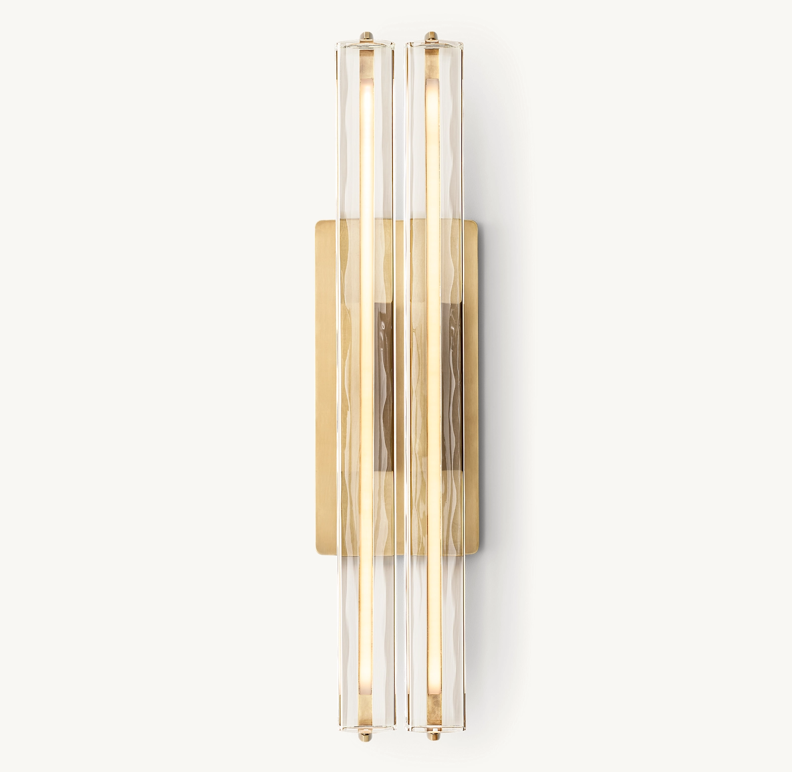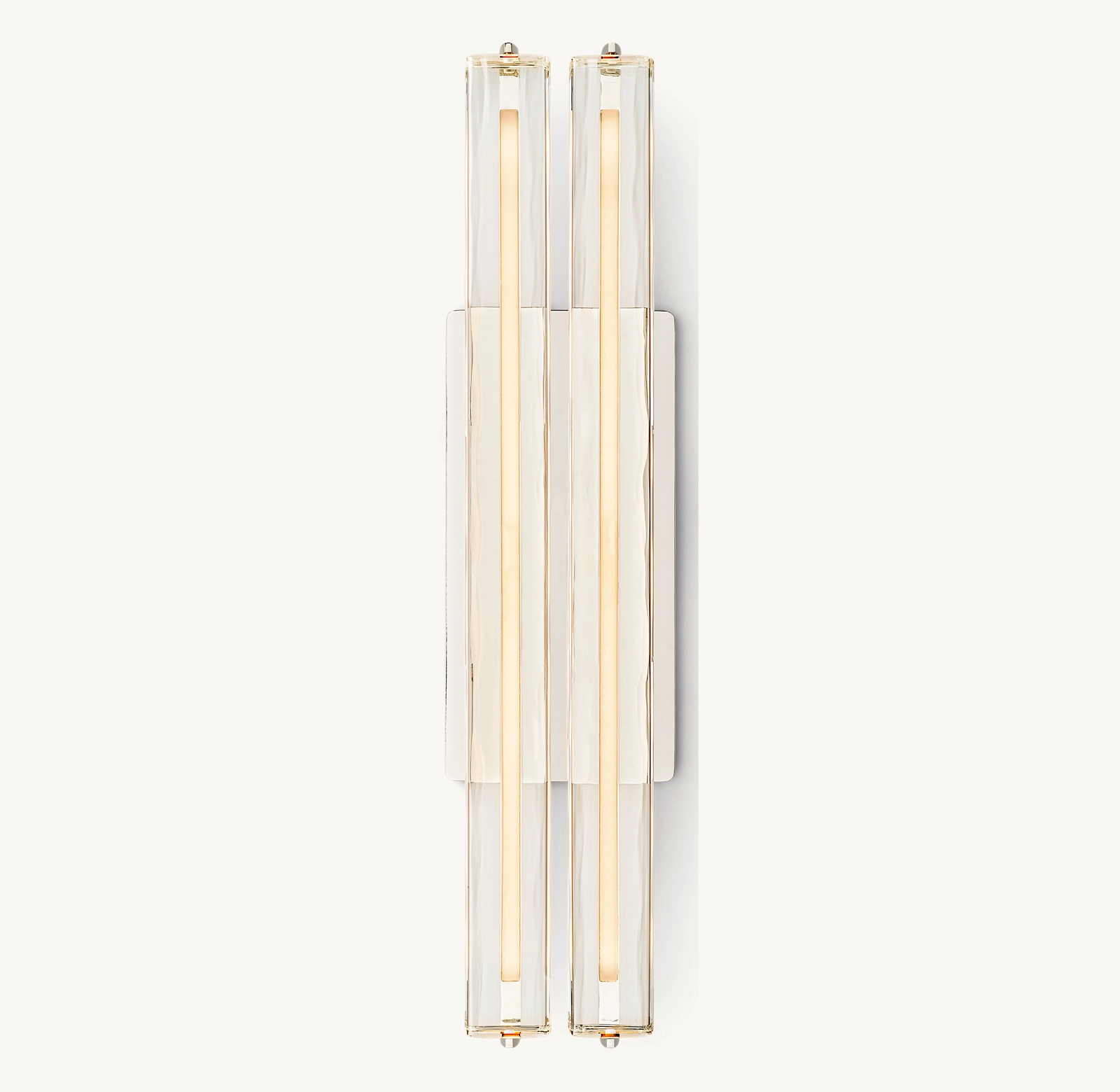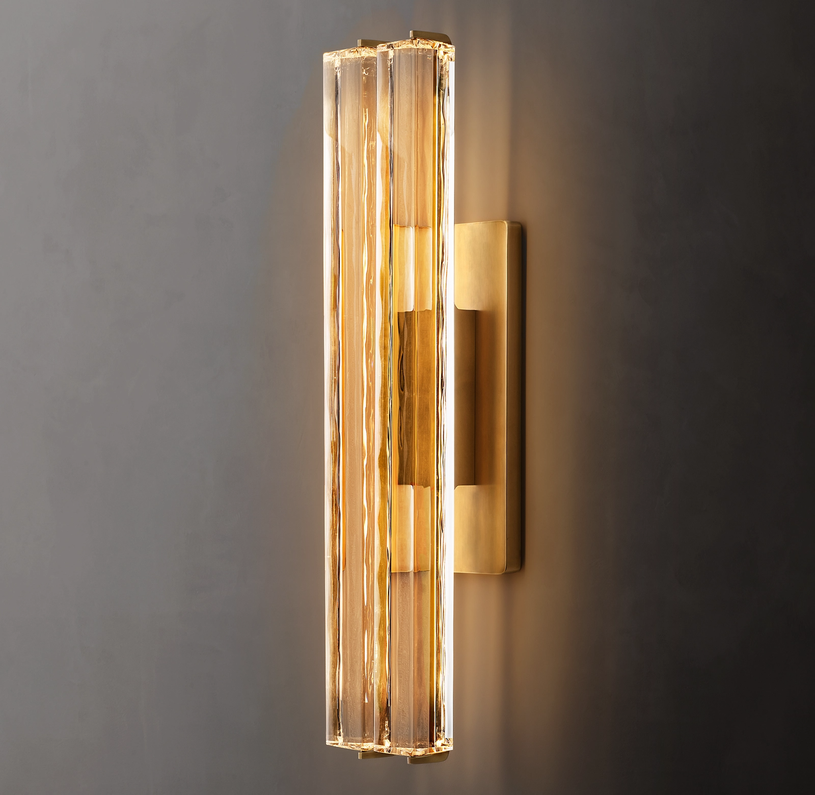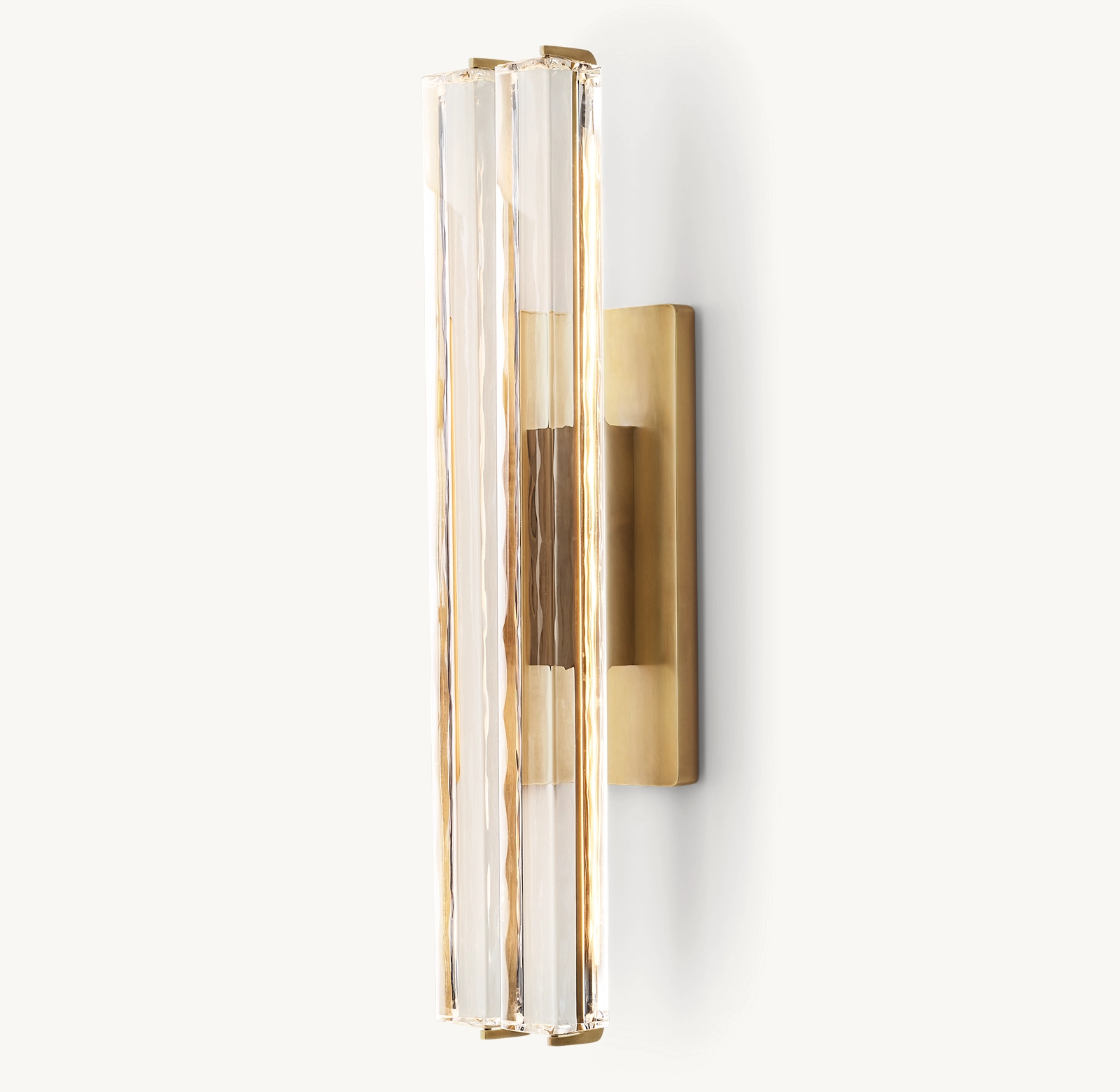 Audubon Crystal Double Sconce  captures the spirit of 1960s Italian minimalism, featuring two prism of hand-polished K9 crystal on a solid brass frame. The reticulated arm directs a swath of light wherever it's needed. Striking yet restrained, it evokes the warmth of candlelight with an elongated LED that casts a beautiful glow through the undulating texture of the glass.